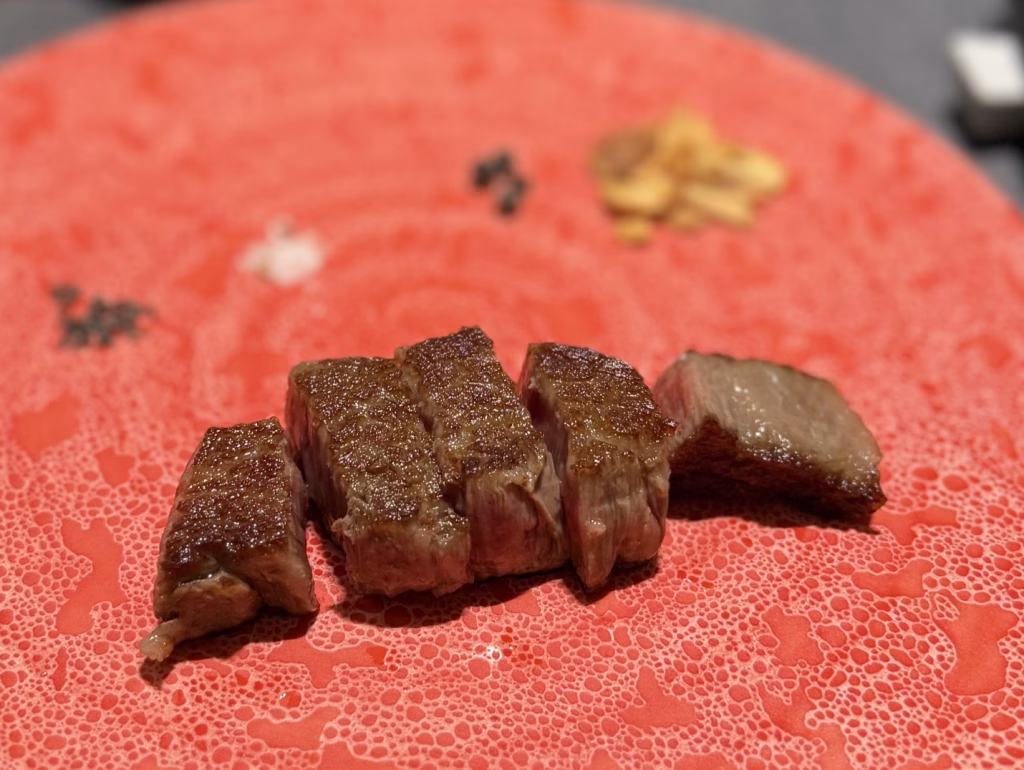 主廚特別提到店內不用A5和牛,理由是A5太油不適合鐵板燒。實際上,這塊A4和牛吃起來油脂分布雖均勻,但肉質平凡、風味單薄,整體沒有亮點。
