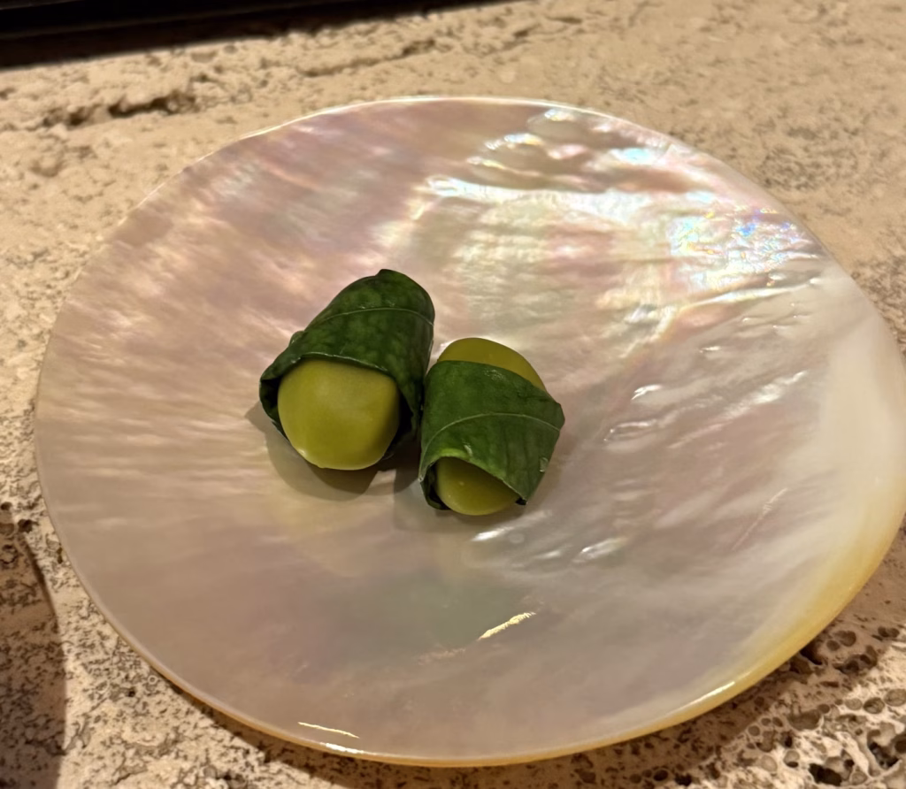 以錫蘭橄欖、巧克力與假蒟葉打造檳榔造型,一入口,假蒟葉的胡椒野性清香便襲來,將這份創意中藏著的台灣在地記憶,極具代表性地呈現出來。