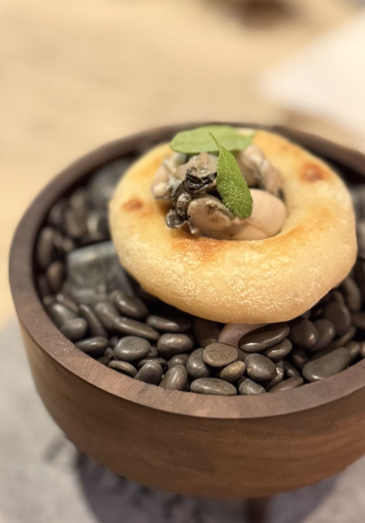 這道非常有趣。肥美的台南北門蚵,被包裹在馬鈴薯麵團與台東糯米老酒粕的組合中。麵團近似濕潤的水潤餅口感,老酒粕發酵的溫暖酒香與蚵仔的礦物鮮味交融,帶來令人驚豔的在地化風味。
