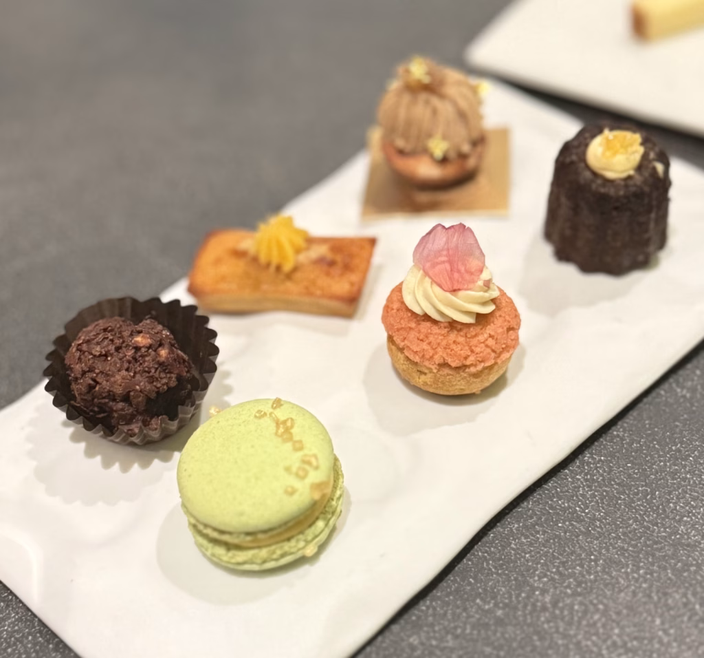 依舊是誠意滿滿的六款小點:金萱柚子可麗露、蒙布朗、覆盆子泡芙、抹茶金桔馬卡龍、鹹蛋黃費南雪、榛果巧克力脆球