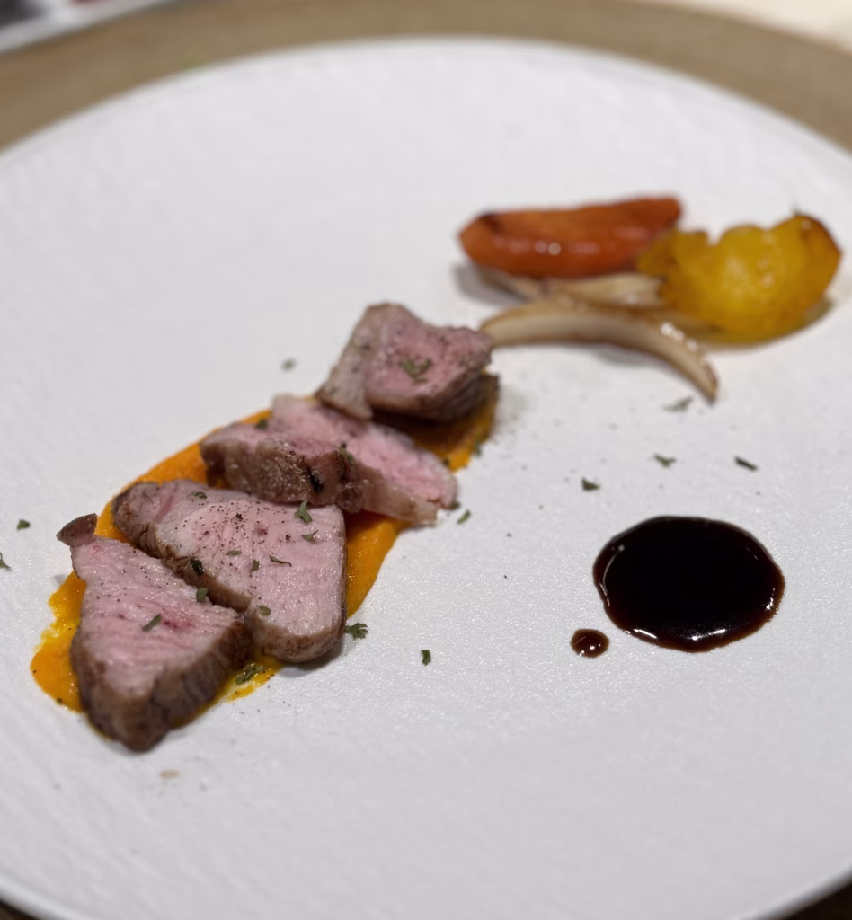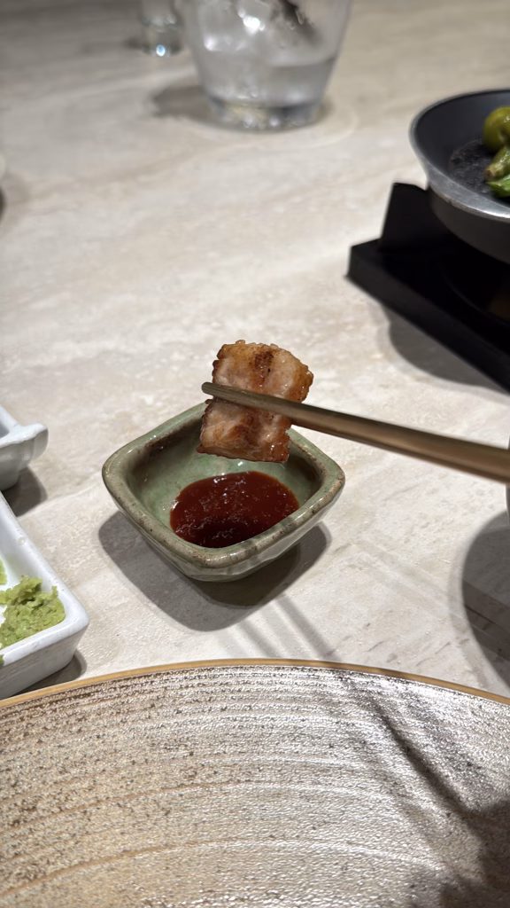 這道是我整場非常喜歡的一道。豬頸肉先在外場稍微烤過,再送到後廚完成,最後搭配胡蘿蔔泥與巴薩米克醋,整體非常軟嫩,而且是那種一吃就知道火候處理得很好的軟嫩。這道讓我明顯感覺到,這間店不是只會做燒肉,而是真的有料理能力。