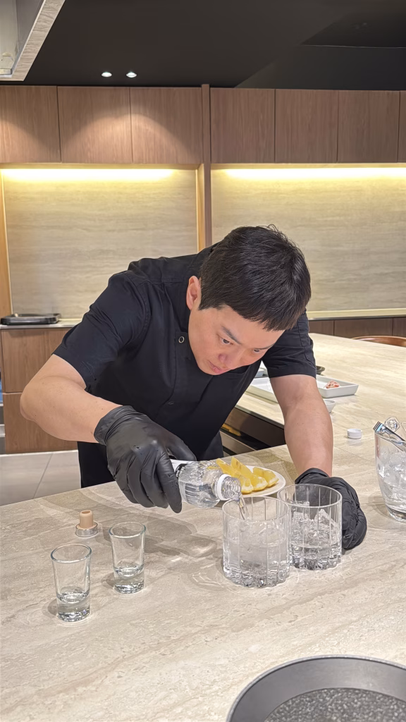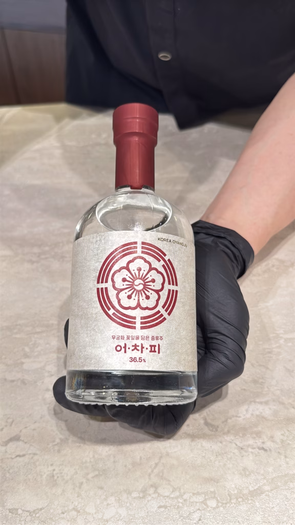 這次點酒的時候其實猶豫了很久,本來想喝點特別的,最後選了一支 韓國國宴等級的燒酎。只是又有點擔心會不會太烈,結果主廚很貼心地幫我們加入氣泡酒跟檸檬,最後變成一杯非常好喝、也很適合搭這整套豬肉料理的版本。