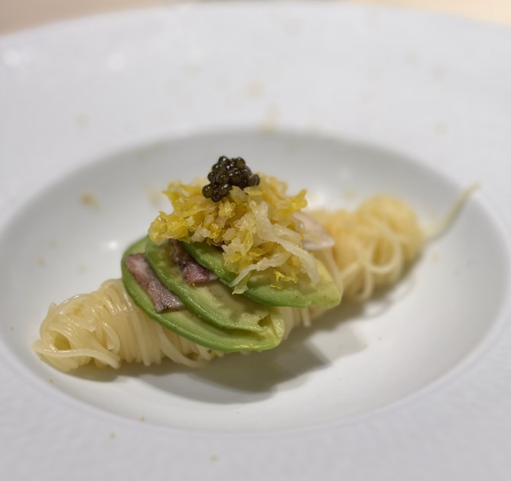 細麵搭配切片酪梨、培根、醬菜與魚子醬,整體吃起來意外清爽。通常講到豬肉套餐,大家會直接聯想到油脂、厚重、鹹香,但這道反而是把豬肉比較輕盈、比較現代的一面做出來。酪梨的柔滑、魚子醬的鹹鮮、培根的存在感,讓整道冷麵不只是解膩,而是本身就很成立。