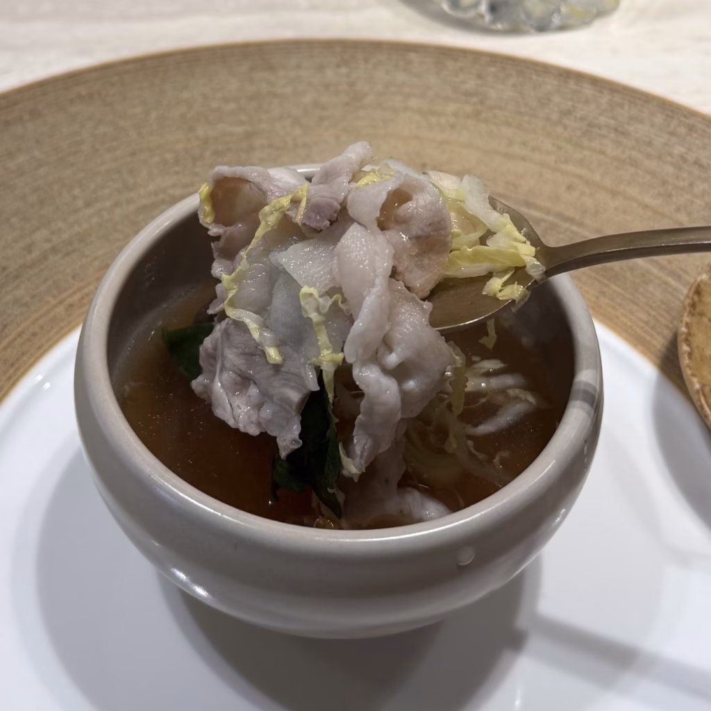 作為鹹食收尾的 豬肉湯飯,也很討喜。湯頭只用豬肉燉煮,卻能呈現出很清甜的輪廓。尤其如果中間有喝點酒,到了這裡喝上一碗,真的很暖胃,也很有讓整場體驗慢慢落地的作用。