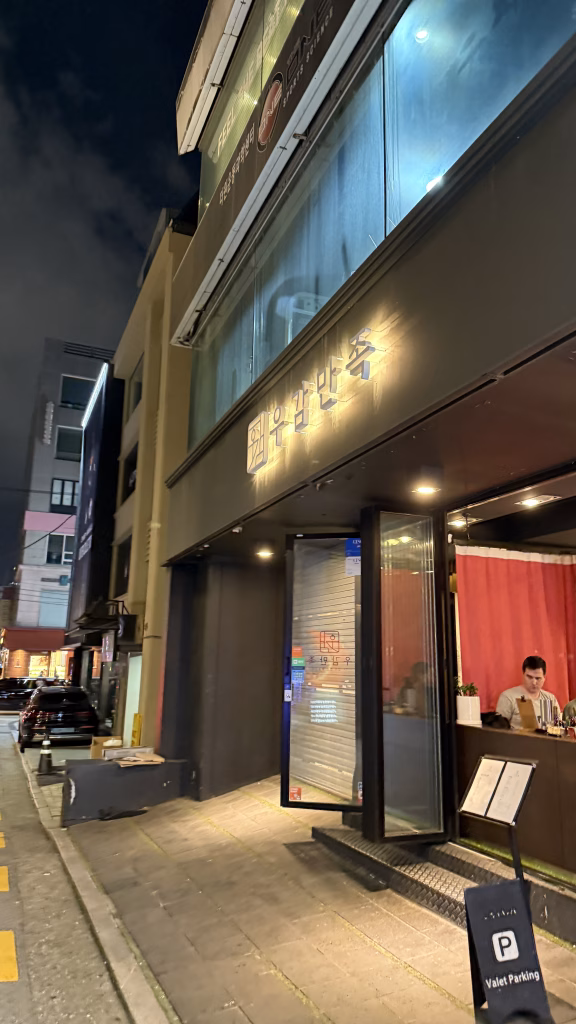 打完醫美後時間有點晚,臨時請店員幫忙推薦附近的燒烤店,於是來到這間在 Catchtable 與 Google 評價皆高達 4.9 星的韓牛 BBQ——우감만족。主打全店僅供應 1++ 等級、BMS No.9(最高脂肪交雜基準) 的韓牛,品質定位極其精確,是專為追求頂級肉質與輕鬆體驗的饕客所設計的避風港。