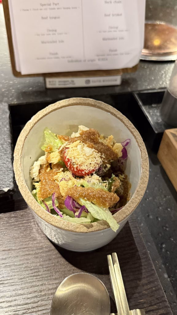 配套的小菜系統極為完整。從酸香開胃的沙拉與冷湯,到炭烤後依然飽滿噴汁的杏鮑菇,每一步都為肉品做好了鋪墊。最後以柚子冰沙與醃漬番茄作結,清新、冰冷、去油膩,整場節奏流暢且完成度高。