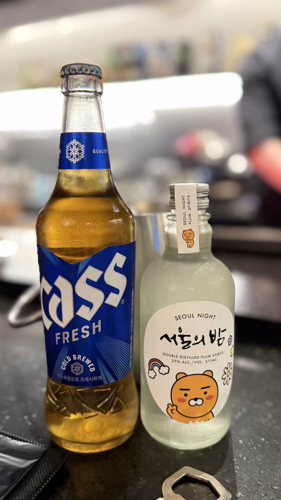 選擇了「Seoul Night」梅子燒酒。其輕盈的果酸與微甜感,恰好化解了頂級韓牛豐富的油脂感,讓味覺維持清爽。當然,搭配經典的 Cass 啤酒,那種碳酸感的衝擊力依然是燒烤派對中永遠的安全牌。
