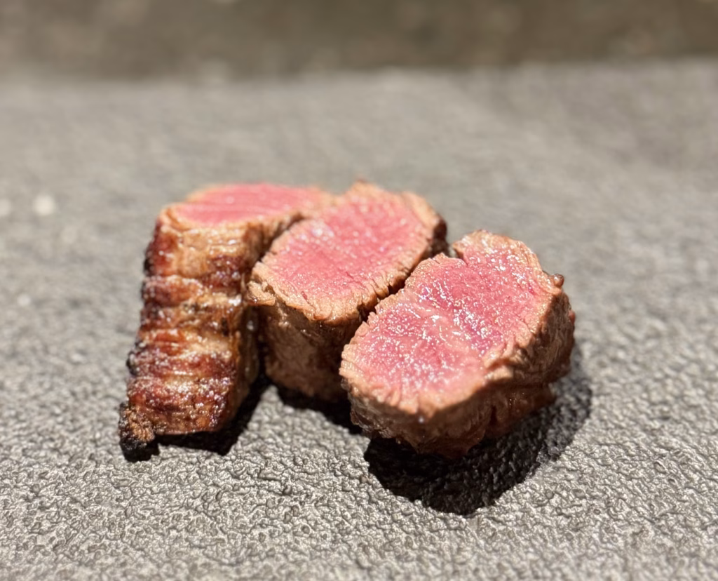 菲力的質地細緻如絲絨般柔嫩。BMS No.9 的油脂均勻分布,幾乎不需多餘調味,舌尖輕壓便能釋放出韓牛特有的優雅甜度,那是種乾淨而深邃的肉香。