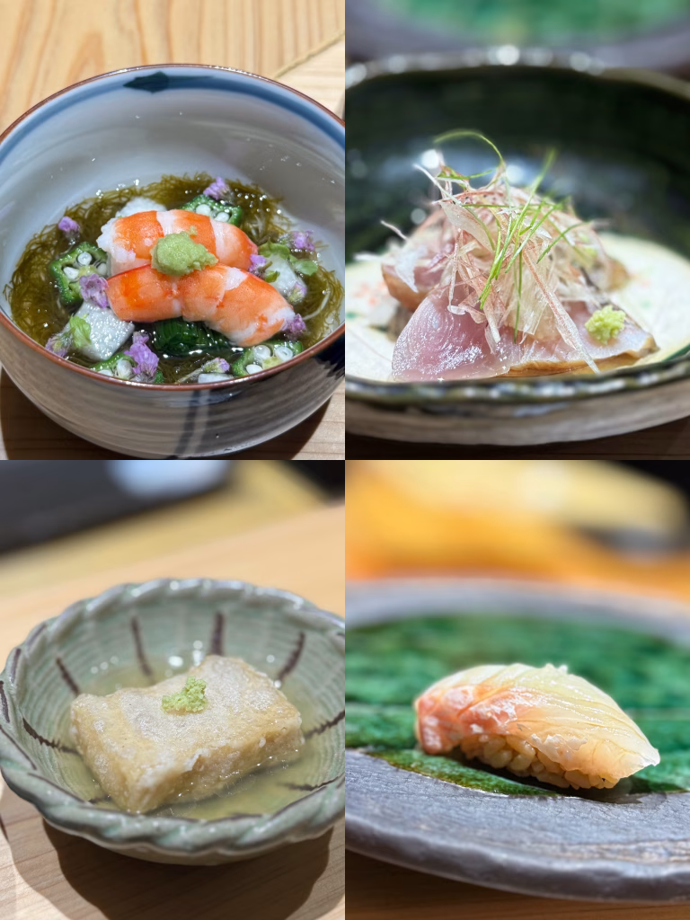 一開始的 水雲醋,搭配日本山藥、秋葵、菠菜與草蝦,整體是很舒服的開場。黏滑感與蔬菜清爽度本來就很適合放在最前面,而它的酸度也抓得剛好,不會過尖,反而有種慢慢把味蕾打開的節奏感。