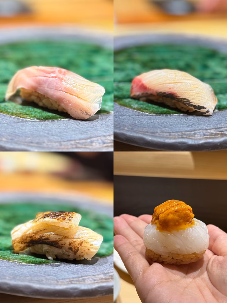接著進入握壽司段,從 真鯛握、愛媛黃雞魚握、白甘握 一路往下,節奏很順,魚料選擇也很舒服。鮨冶吉一直以來給我的感覺不是那種要靠極端炫技去製造驚喜的店,而是用整體節奏與穩定度,慢慢把你帶進狀態。